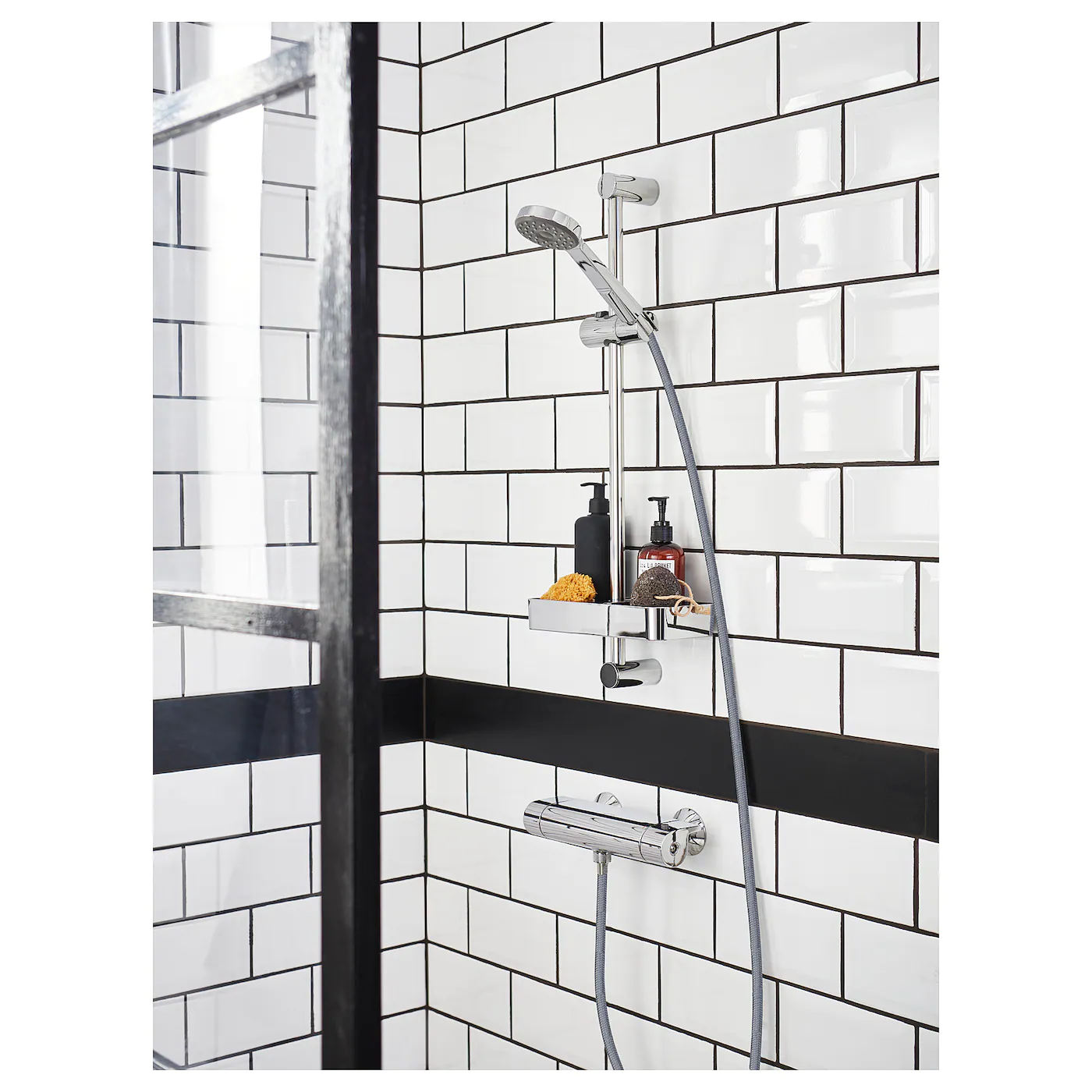 You can easily adjust the height of the shower shelf thanks to the flexible bracket on the rail. Water drains easily through the holes in the bottom of the shelf. The chrome-plated surface is a hard, durable and easy to clean.Material