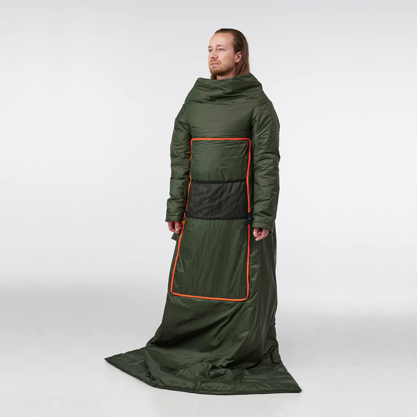 It surrounds you and stays in place thanks to the sleeves and button fastener in the back. Keeps you warm and snug when travelling, commuting or when you long for extra coziness indoors.Material