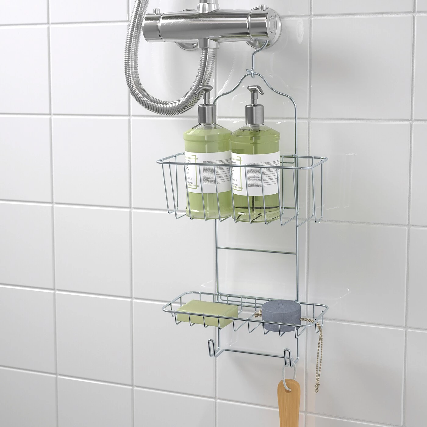 Two convenient hooks for hanging brushes or bath sponges. Two shelves with ledges keep bottles from falling to the floor.Steel, Galvanized, Polyester powder coating