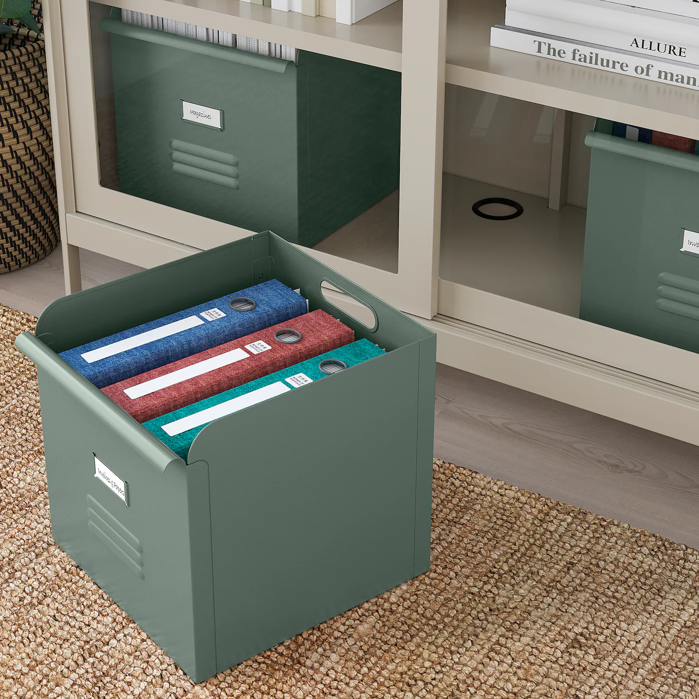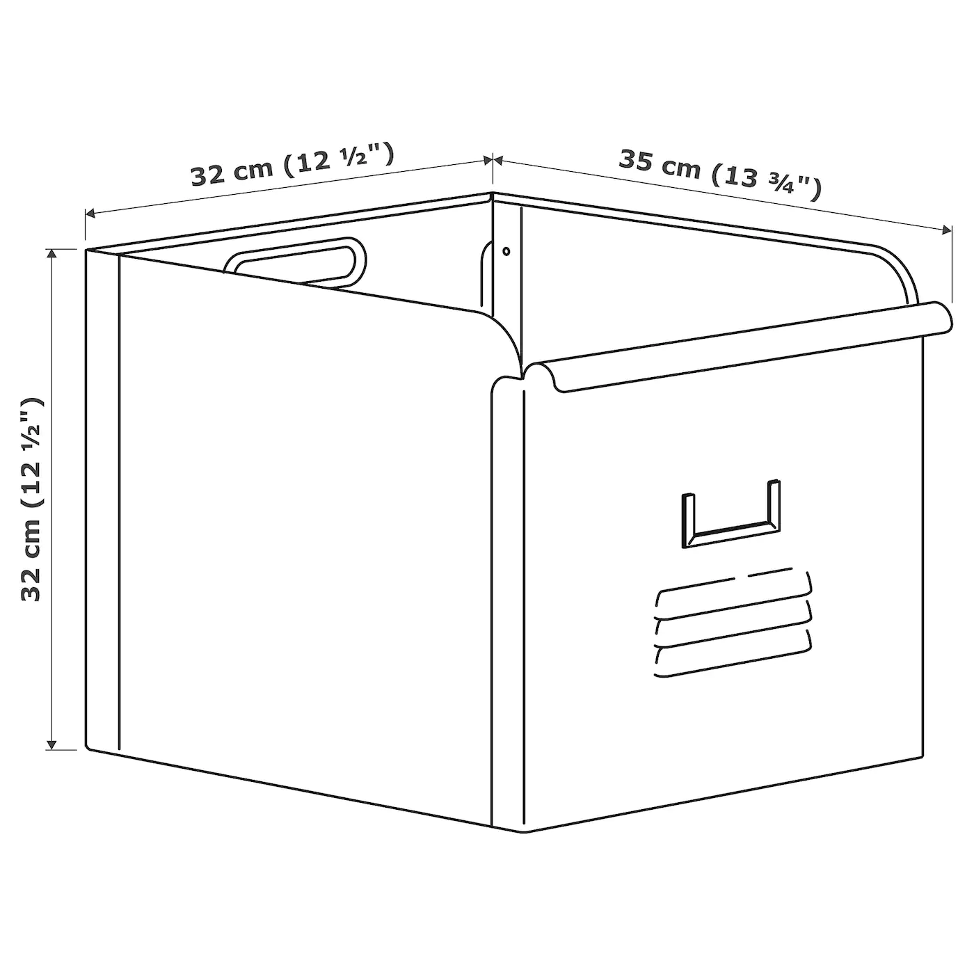 Fits perfectly in KALLAX shelving unit and other units with shelves which are at least 12⅝” deep. The felt pads underneath protect the surface below against scratches. The label holder makes it easy to mark and find what you are looking for. Easy to pull out and lift since the box has a handle.Material