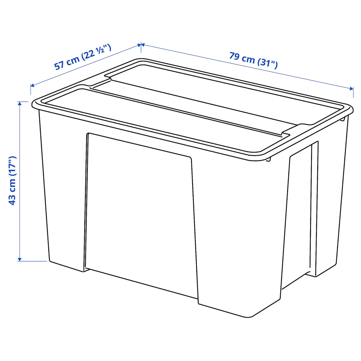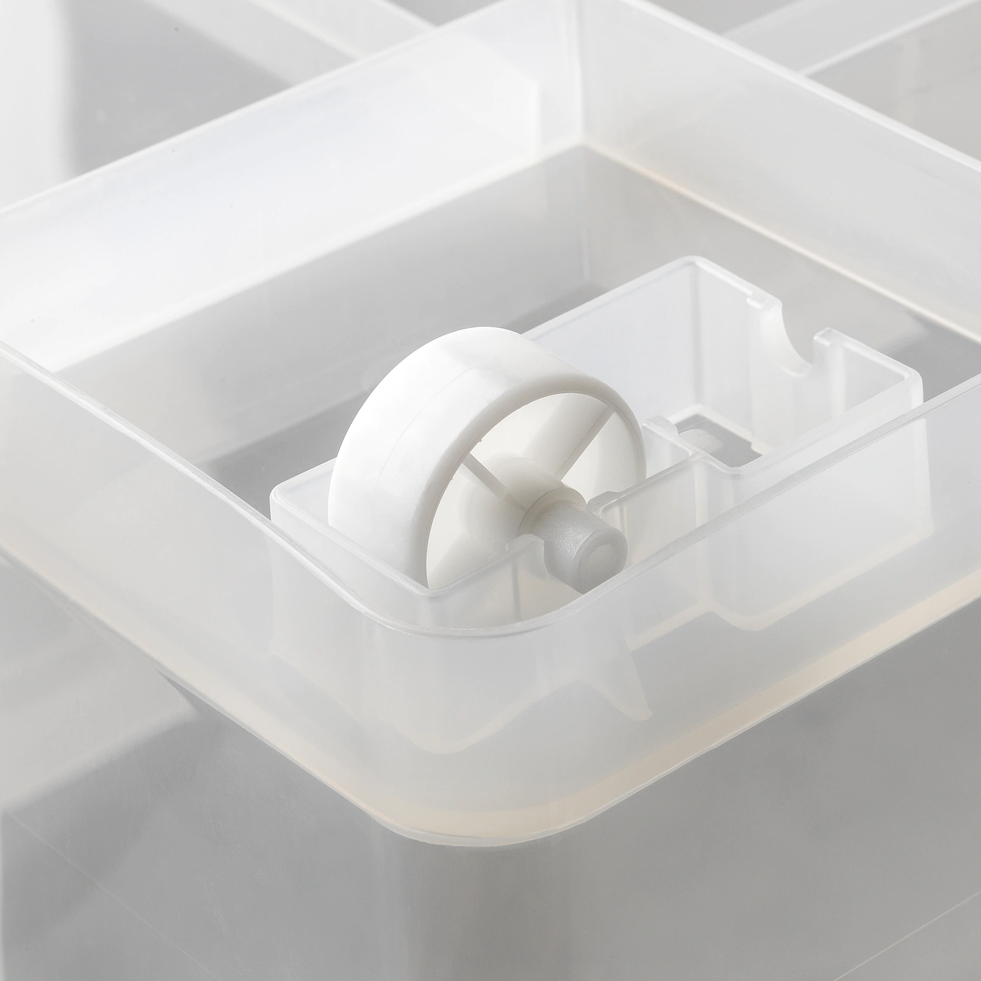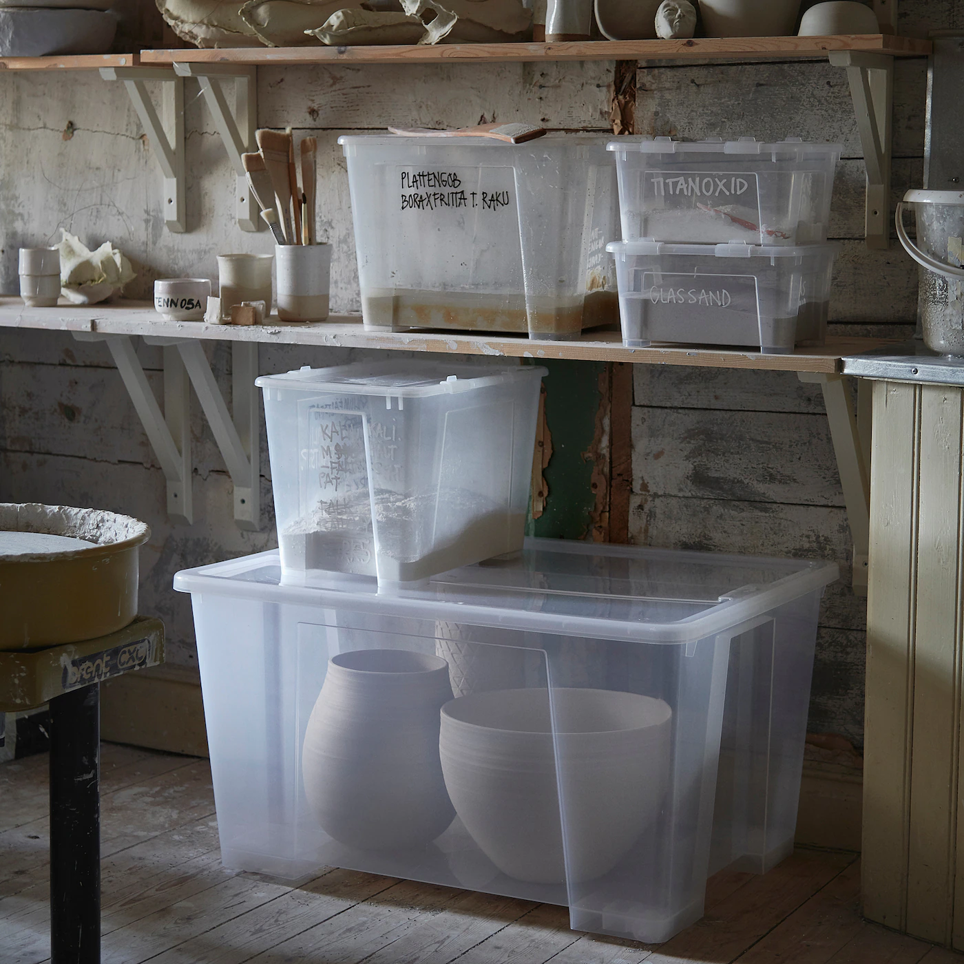The box is easy to move since you can change and adjust the direction of the 4 castors so that they roll smoothly, regardless if you position the short or long side outwards. The built-in click function keeps the lid in place which protects your things from dirt and dust. The box is made of transparent plastic so you can quickly and easily find what you need.Material