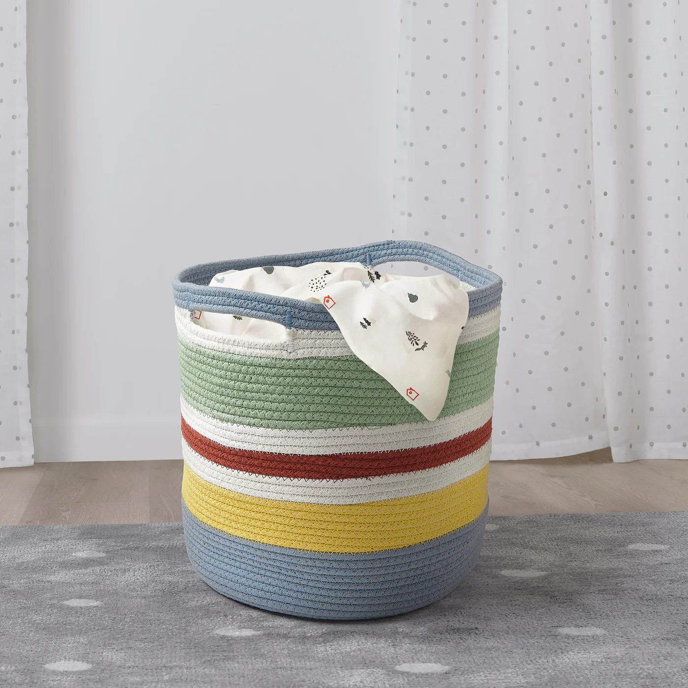 Practical and decorative storage that makes it easier for you and your child to keep track of everything from toys and towels to throws and laundry. The storage bag is easy for your child to lift and carry since it is lightweight and has handles on both sides. So sturdy that it stands on its own, even when the bag is empty. Easy to fold and store away.Material