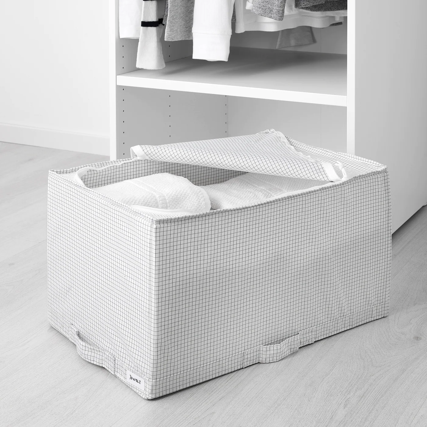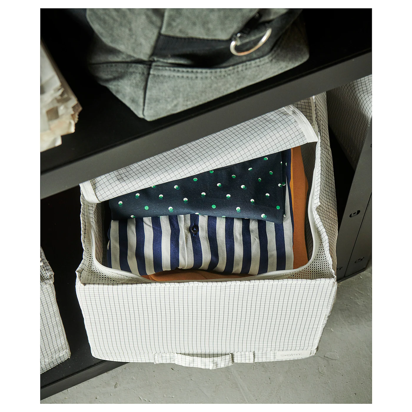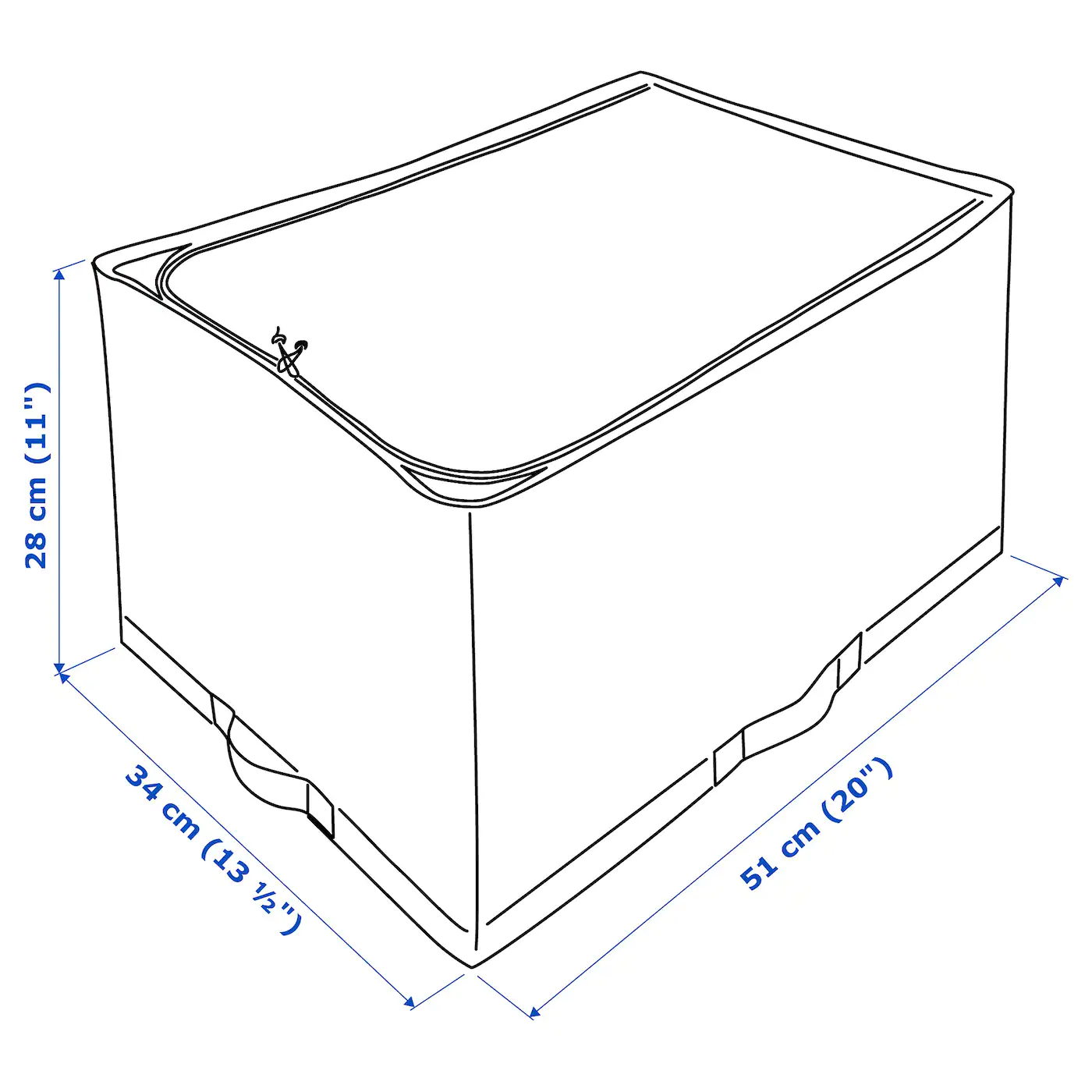 Your stored clothes and textiles stay fresh longer, as ventilation nets in the corners allow air to circulate. The label holder helps you organize and find your things. Easy to pull out and lift as the box has handles.Material