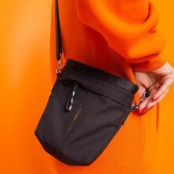 One large and one small compartment with zippers that hold everything from a wallet and cell phone to a passport and hairbrush. On the back there is an open compartment where you can store smaller things that you want to access quickly. The yellow inner lining allows you to easily see and find your things. The bag is comfortable to carry and sits firmly in place since the shoulder strap is easy to adjust. The fabric is made of recycled polyester. Using waste as a resource takes us one step closer to a more sustainable future.Material